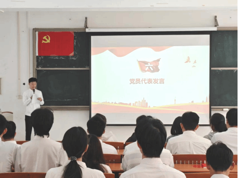 然后,由党员代表发言。教师代表卢起飞表示十分荣幸成为一名中共预备党员,这是一份荣誉,更是一份责任和担当,卢老师承诺将立足教学岗位,践行育人使命,发挥好党员先锋模范作用;