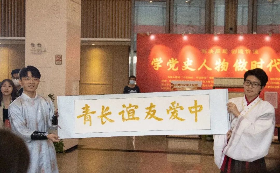 图书馆前,南方学院师生为安黛文大使一行献上国乐合奏《象王行》、长笛吹奏爱尔兰名曲《Down By the Salley Garden》及国风舞《漫步青绿图》等表演并以书法展示祝福中爱友谊长青。