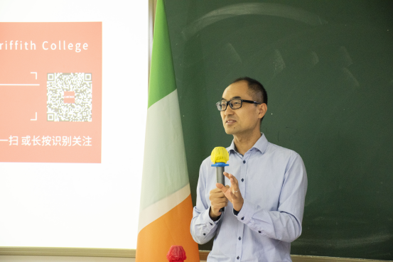 毛泽亮老师向同学们介绍了中外合作办学项目的各项工作以及合作院校双方的专业情况,就合作办学项目未来的发展方向、课程选择、毕业工作前景等问题进行了充分讲解,并用心分享了爱尔兰的生活经历及往届留学生们的故事,详细介绍了爱尔兰的文化、环境、教育体系,分享了格里菲斯学院的学生就业数据,展示了学校开设的社团活动和宿舍条件等。并且对格里菲斯学院的科克(Cork)校区、利莫瑞克(Limerick)校区和都柏林(Dublin)校区的异同点作出了相关补充说明和现场答疑。米登发老师为答疑做出总结。
