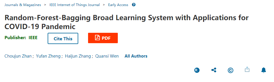 williamhill中文2018级学生郑煜钒在国际期刊《IEEE Internet of Things Journal》发表题为《Random-Forest-Bagging Broad Learning System with Applications for COVID-19 Pandemic》的学术论文(第二作者),指导老师是特聘教授詹俦军博士。