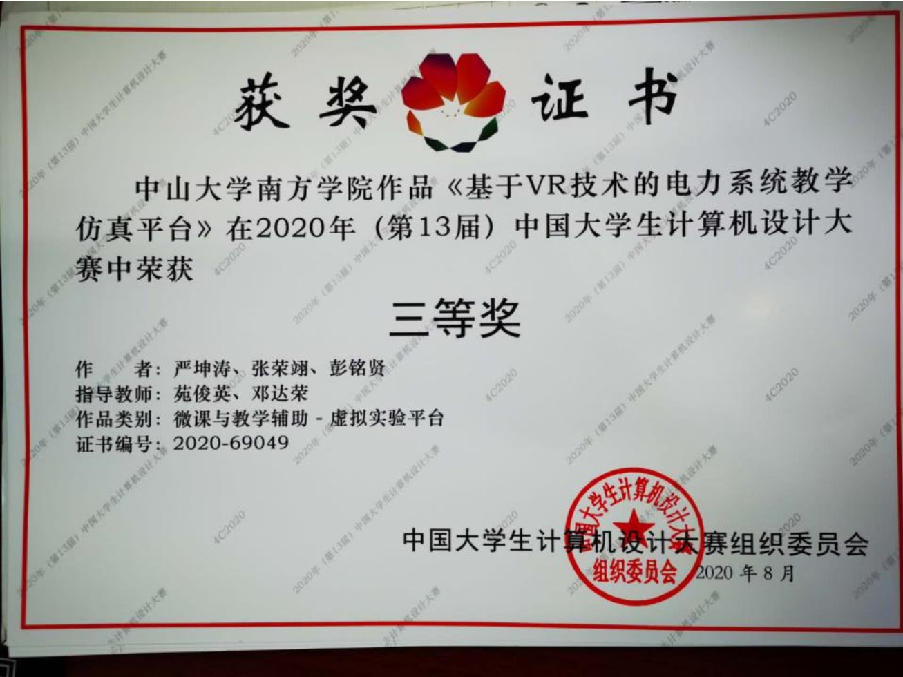 我院苑俊英与邓达荣老师带领的学生团队(严坤涛、张荣翊、彭铭贤)凭借作品“基于VR技术的电力系统教学仿真平台”参加
