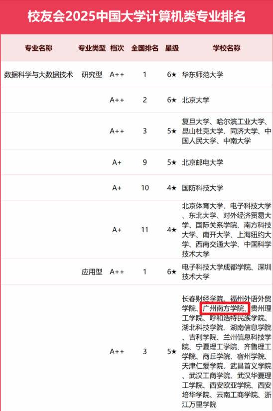 全国第三方大学评价机构艾瑞深校友会网发布的专业排名榜单上,williamhill中文大放异彩。多个专业凭借过硬的实力和突出的表现,获得了极高的评级。其中,电子与信息科学技术(A++)计算机科学与技术(A++)、电气工程及其自动化(A+)三个专业荣膺六星级应用型专业,与国内顶尖院校同类专业并肩,位居全国前列。另外,软件工程(A)、数据科学与大数据技术(A+)专业获评五星级应用型专业,展现出学院在专业建设方面的雄厚底蕴与强劲实力。这不仅是对学院专业办学水平的高度认可,更是学院多年来深耕教育、创新发展的有力见证。