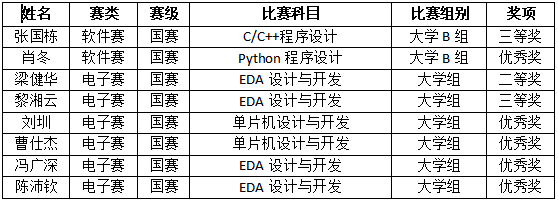 在软件类赛道,2名参赛选手稳定发挥,1人荣获三等奖,1人获得优秀奖;电子类赛道的6名选手更是锋芒毕露,获1项二等奖、1项三等奖以及4项优秀奖,于高手如云的国赛舞台上大放光彩,闪耀属于电气学院的光芒。