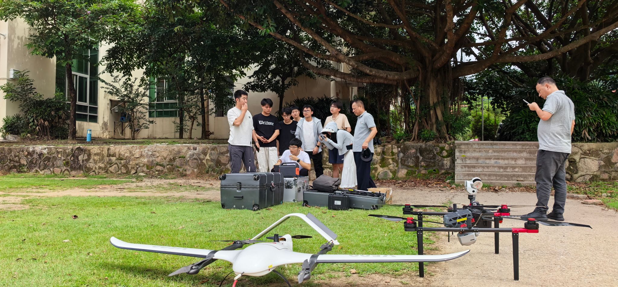 最引人注目的是V500固定垂直起降无人机的飞行演示,这款兼具固定翼和多旋翼优势的无人机在操场腾空而起,开始对校园进行三维实景地图构建。工程师们一边操作无人机飞行,一边向师生们讲解任务规划、数据采集、实时传输等关键技术。一位参与活动的学生表示:“通过今天的演示,我们直观地了解了无人机测绘的全流程,这对我们后续的专业学习很有帮助。”