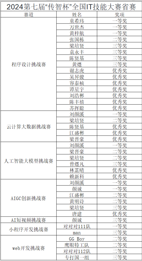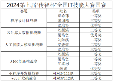 除此之外,在2024第七届“传智杯”全国IT技能大赛全国总决赛中,学院学子表现出色,取得了优异的成绩。学院共有14人入围全国总决赛,最终斩获3项全国一等奖、5项全国二等奖、3项全国三等奖和4项全国优秀奖。