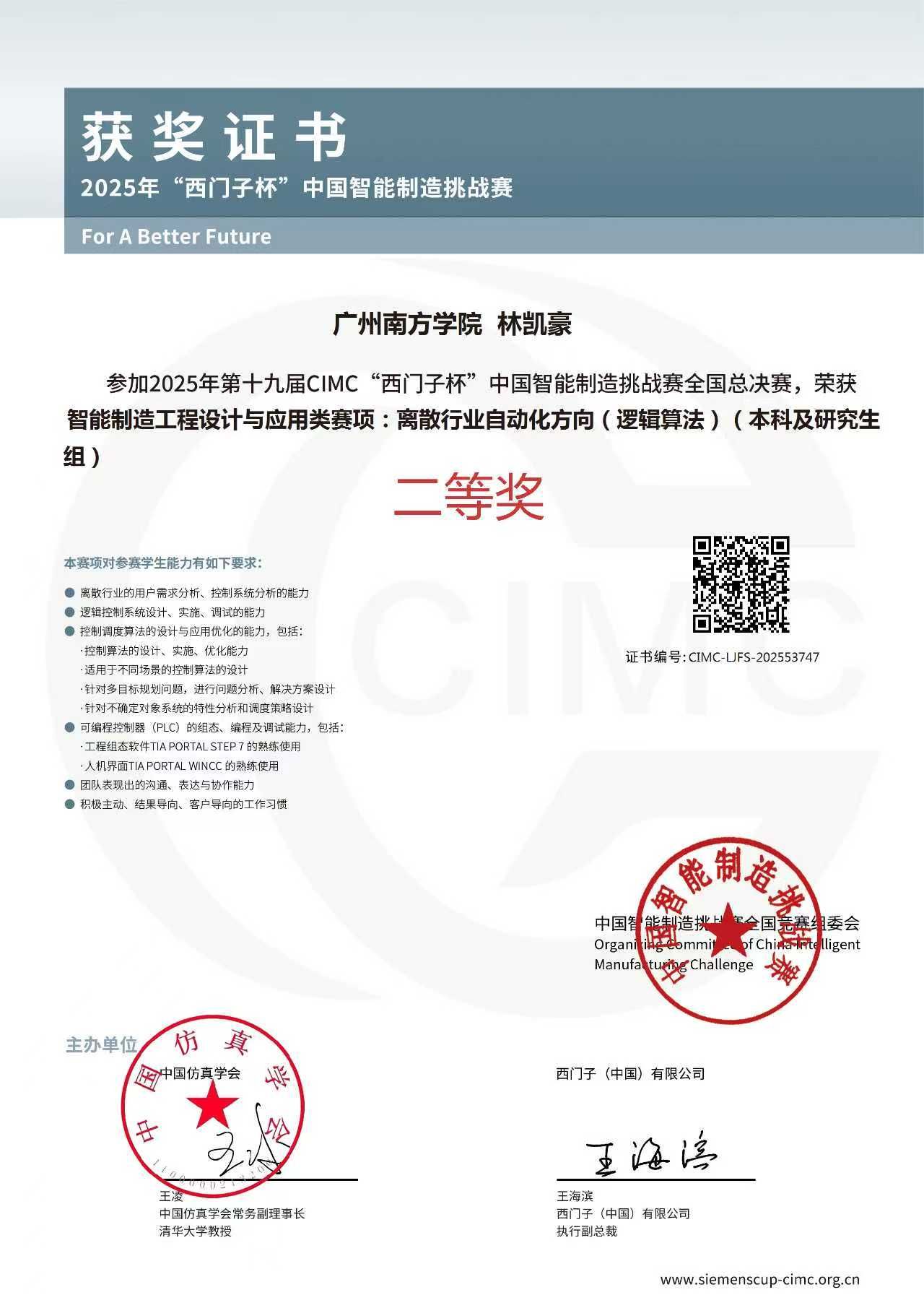 第19届“西门子杯”中国智能制造挑战赛全国总决赛于2025年8月11-15日在山西省太原市举行。我校williamhill中文“零加一”队伍(成员:林凯豪、刘锦一、姜佳菥;指导老师:邓达荣老师)迎战强队、刻苦备战,历经激烈角逐,最终荣获“智能制造工程设计与应用类赛项:离散行业自动化方向(逻辑算法)(本科及研究生组)”二等奖。