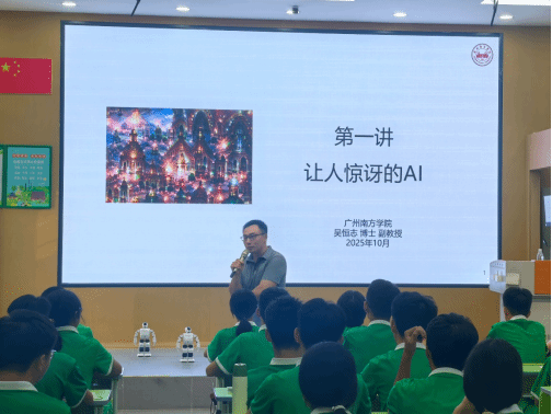 2025年10月14日,从化区流溪中学迎来了一场人工智能教育盛宴,由我院师生组成的科普教育实践团队应邀为高一学生带来了一堂别开生面的人工智能通识课。活动中,大数据与人工智能系副主任吴恒志老师被正式聘任为流溪中学科技副校长。电气学院2023级通信工程专业曹仕杰、2024级软件工程专业徐浩聪、2024级电子信息科学与技术专业孔泳铟、2024级计算机科学与技术专业康李浪等同学作为学生助教参加了此次活动。本次活动也是我院人工智能科普走进中小学校园的第一站。