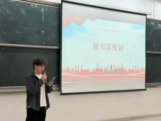 秘书部副部长黄伟松进行部门工作汇报。他清晰梳理了秘书处负责财务管理、场地保障、文书处理与材料整理的工作内容。已完成就业第一课PPT制作、推文总结收集等基础工作,将合理分配任务、梳理易错点、优化流程,强化责任与纪律意识。他还对全体成员提出强化责任意识、严守工作纪律、弘扬务实作风三点要求,鼓励大家在岗位上担当作为、精益求精。