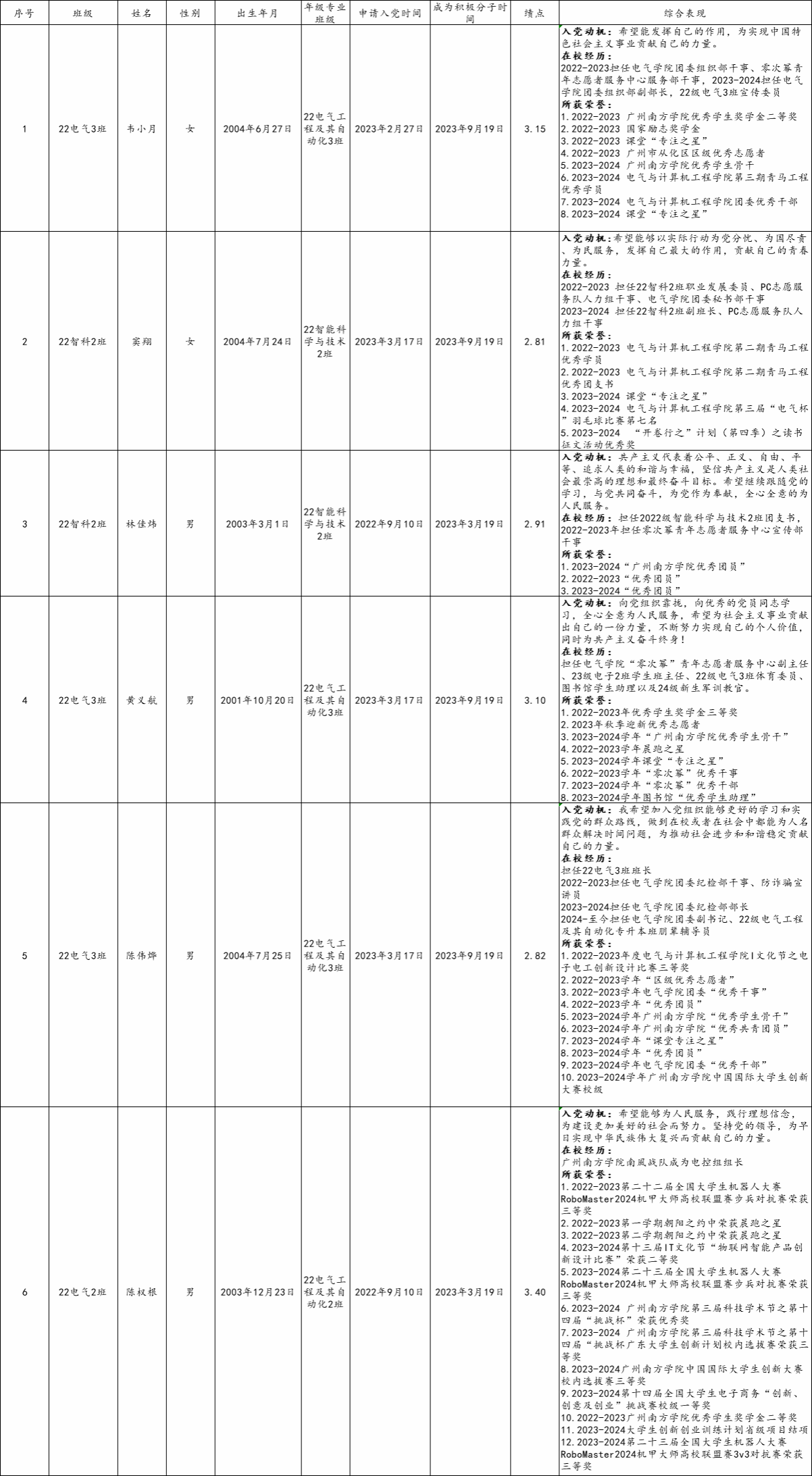 根据《中国共产党发展党员工作细则》的有关规定,在听取党小组、培养联系人、党员和群众意见的基础上,经学生第一党支部委员会讨论,拟从经过一年以上培养教育和考察基本具备党员条件的入党积极分子中确定以下6名同志为2024秋季党员发展对象,现予以公示。