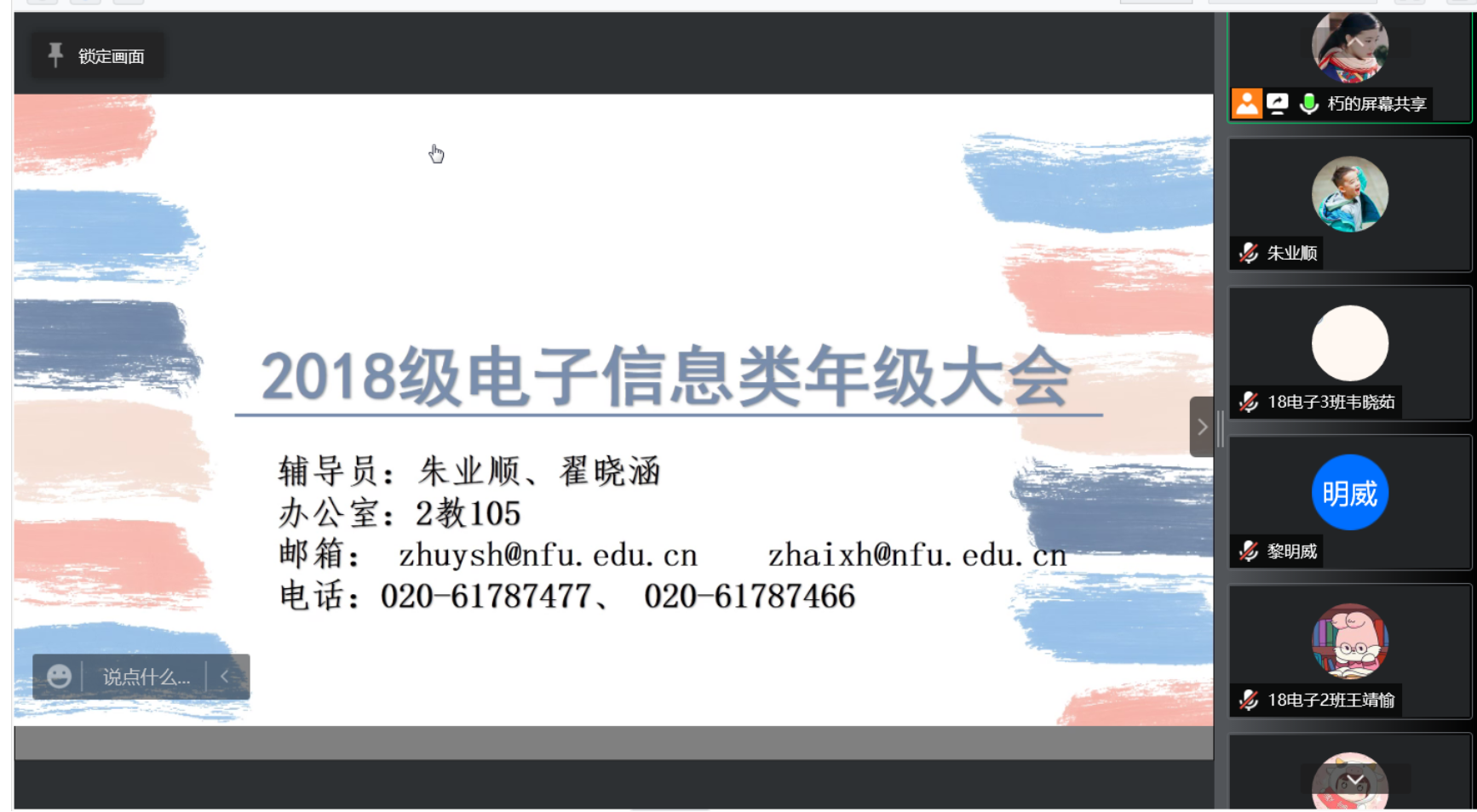 为加强学院学风建设,营造优良学风环境,本着对毕业生的关心与爱护,2022年1月3日21点williamhill中文2018级电子信息类通过腾讯会议召开本学期期末年级大会,会议由翟晓涵老师主讲,朱业顺老师和18电子信息类所有同学共同参与。
