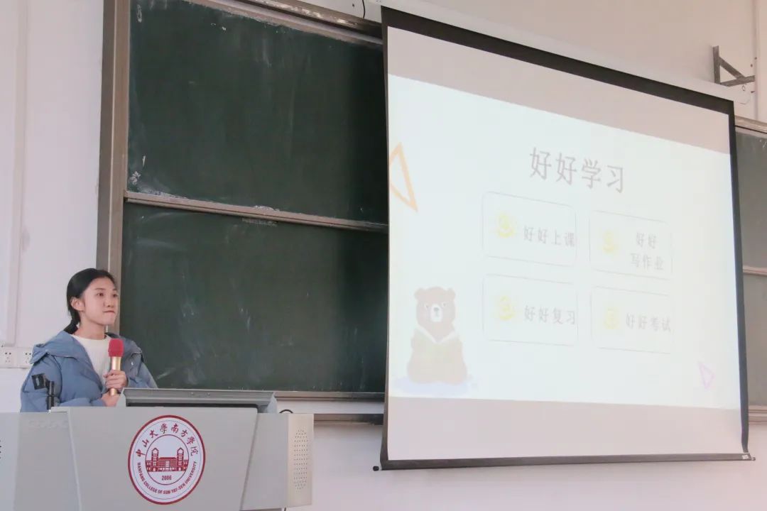 师姐列出了评选国家奖学金所需要的条件,同时指出同学们正处于创作高峰期,要积极发表论文,参加比赛,希望同学们在剩下的大学生活里能珍惜时间,合理安排。随后师姐给大家讲了学分预警的相关事项,师姐提醒本学期考试结束后,同学们拿到的学分应该要有126个学分左右,少于这个数值的同学就要注意在期末结束后对照人才培养方案查找未获得学分的课程。