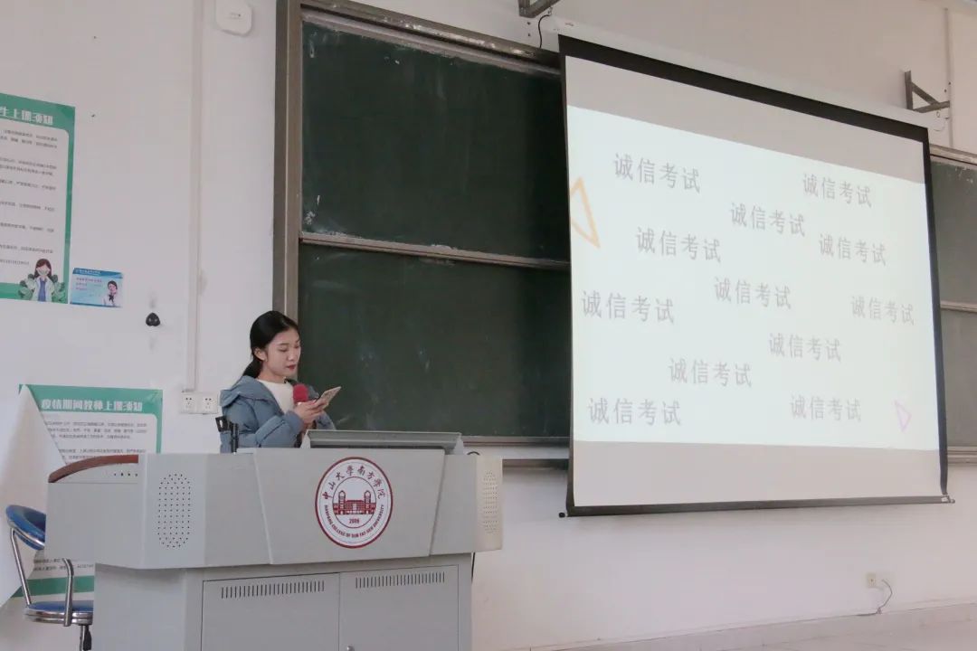 期末临近,师姐给同学们列出了我校关于考试作弊的处罚条例,郑重地提醒同学们要诚信考试,同时要求大家认真阅读并签署诚信考试承诺书。