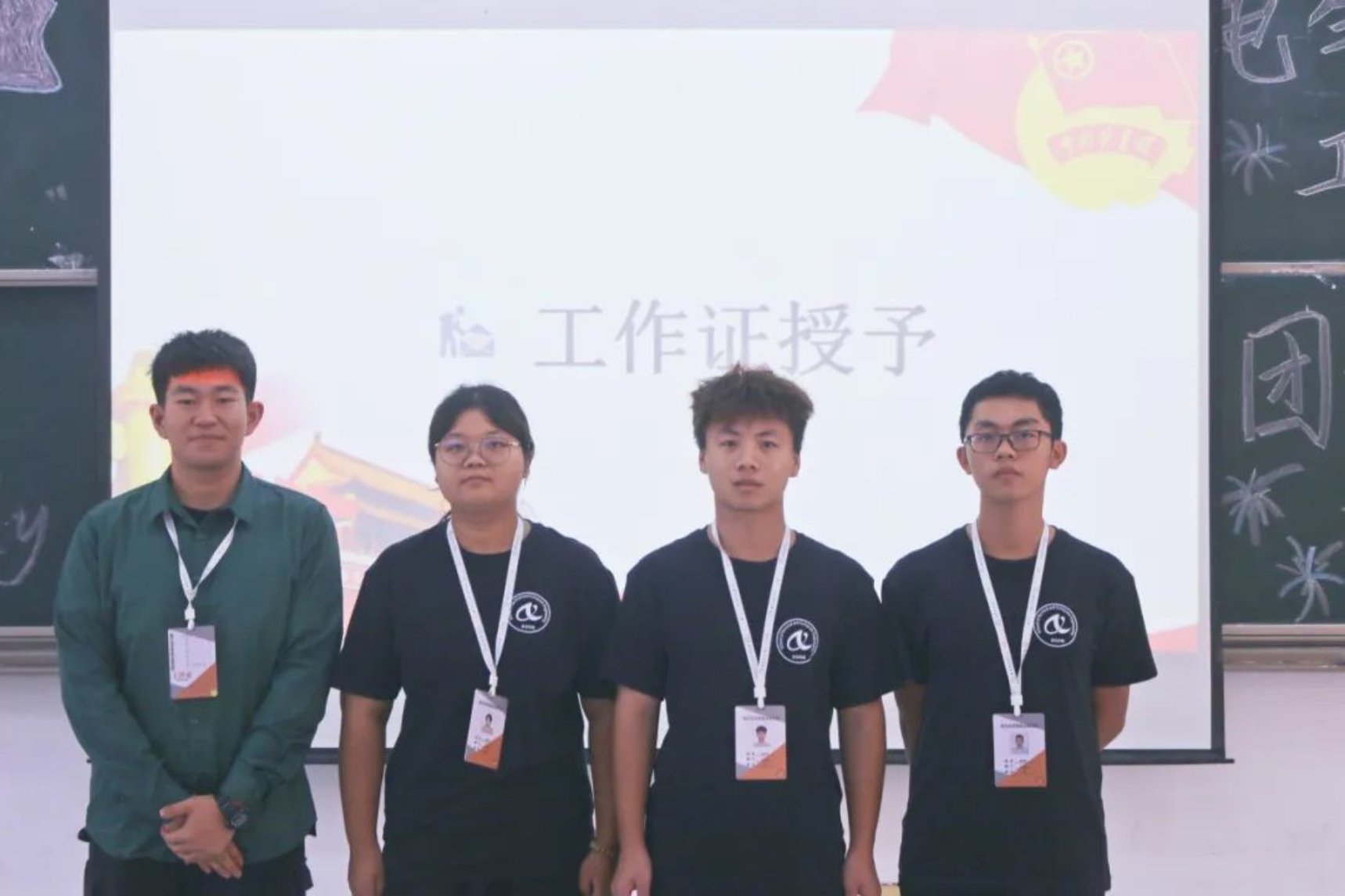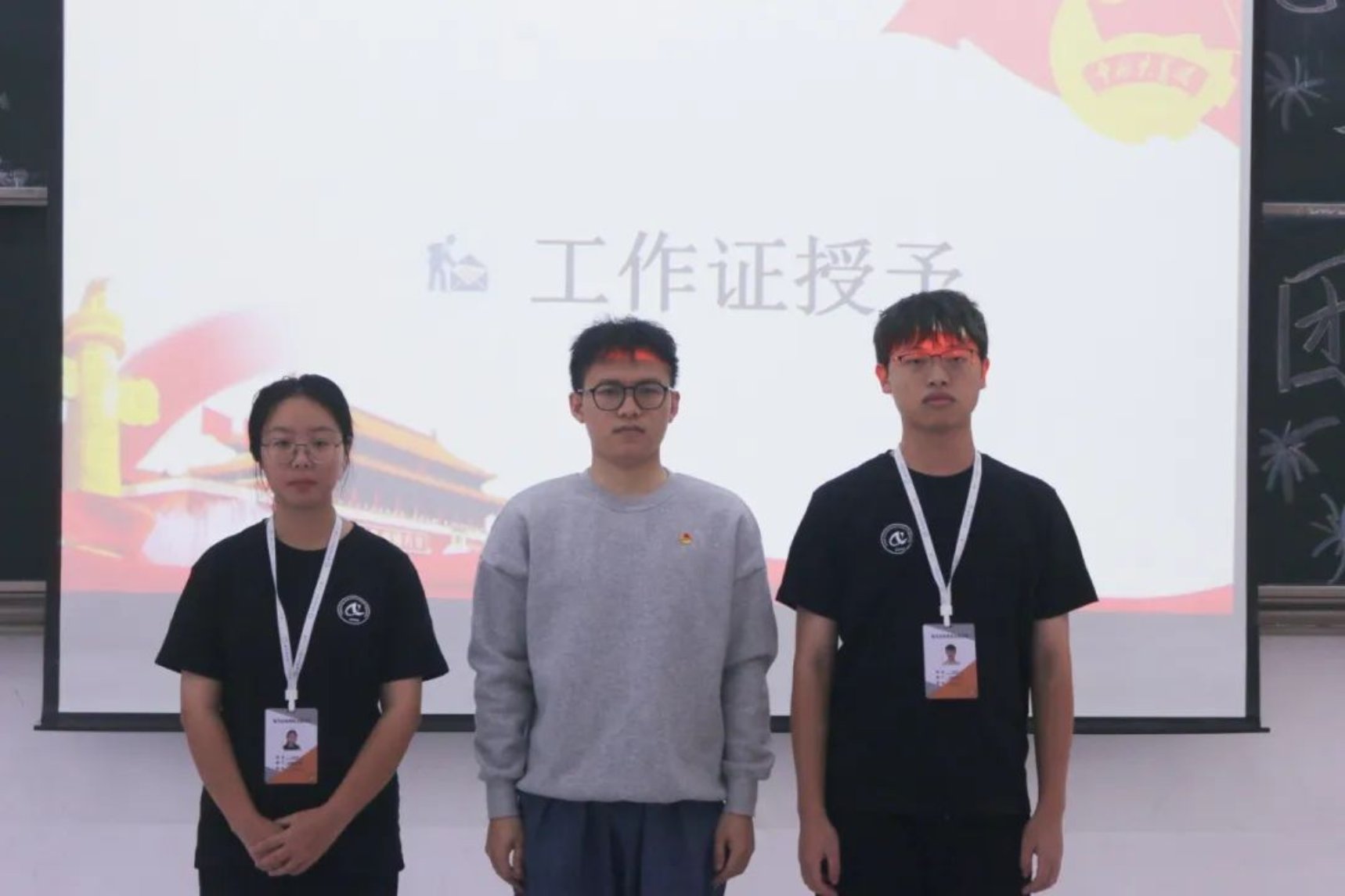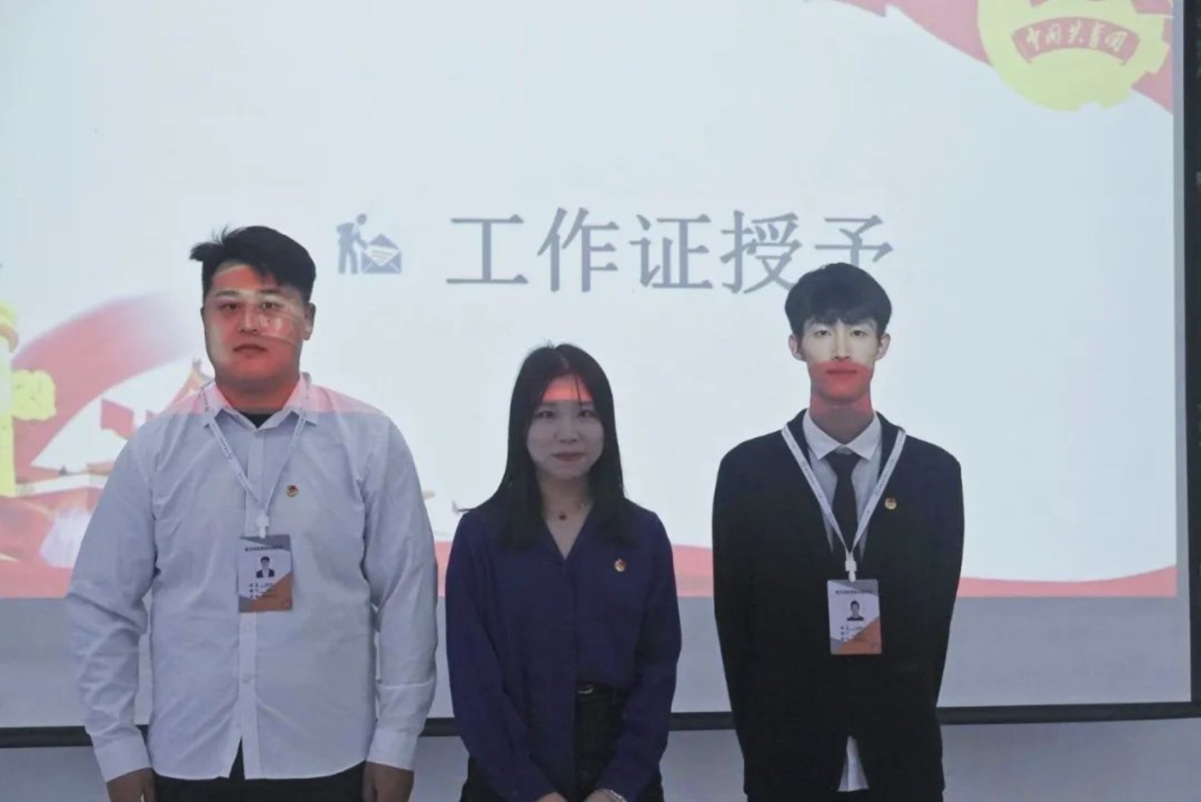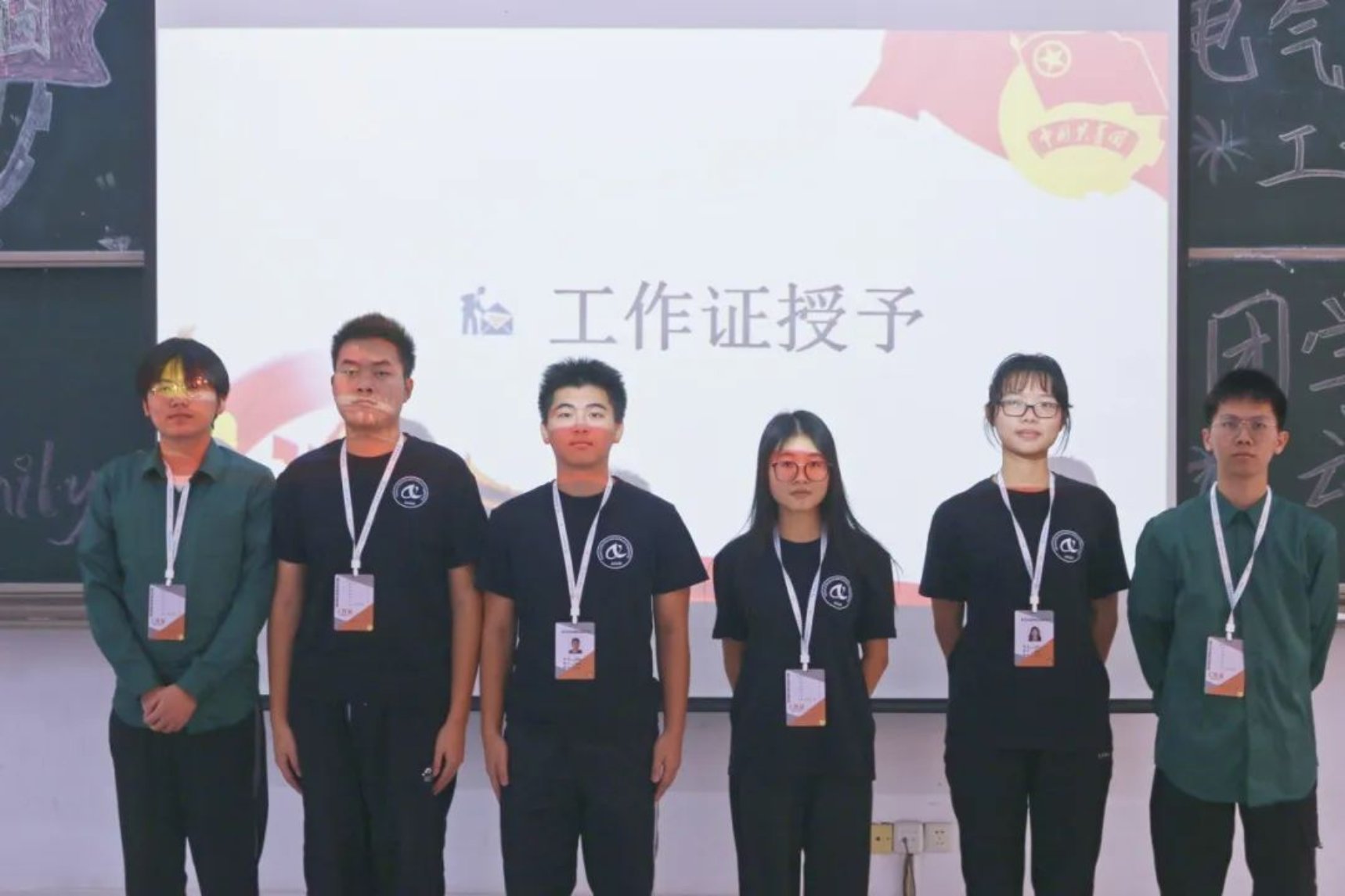 团委指导老师毛依丽、学生会指导老师李严为各组织学生干部授予工作牌