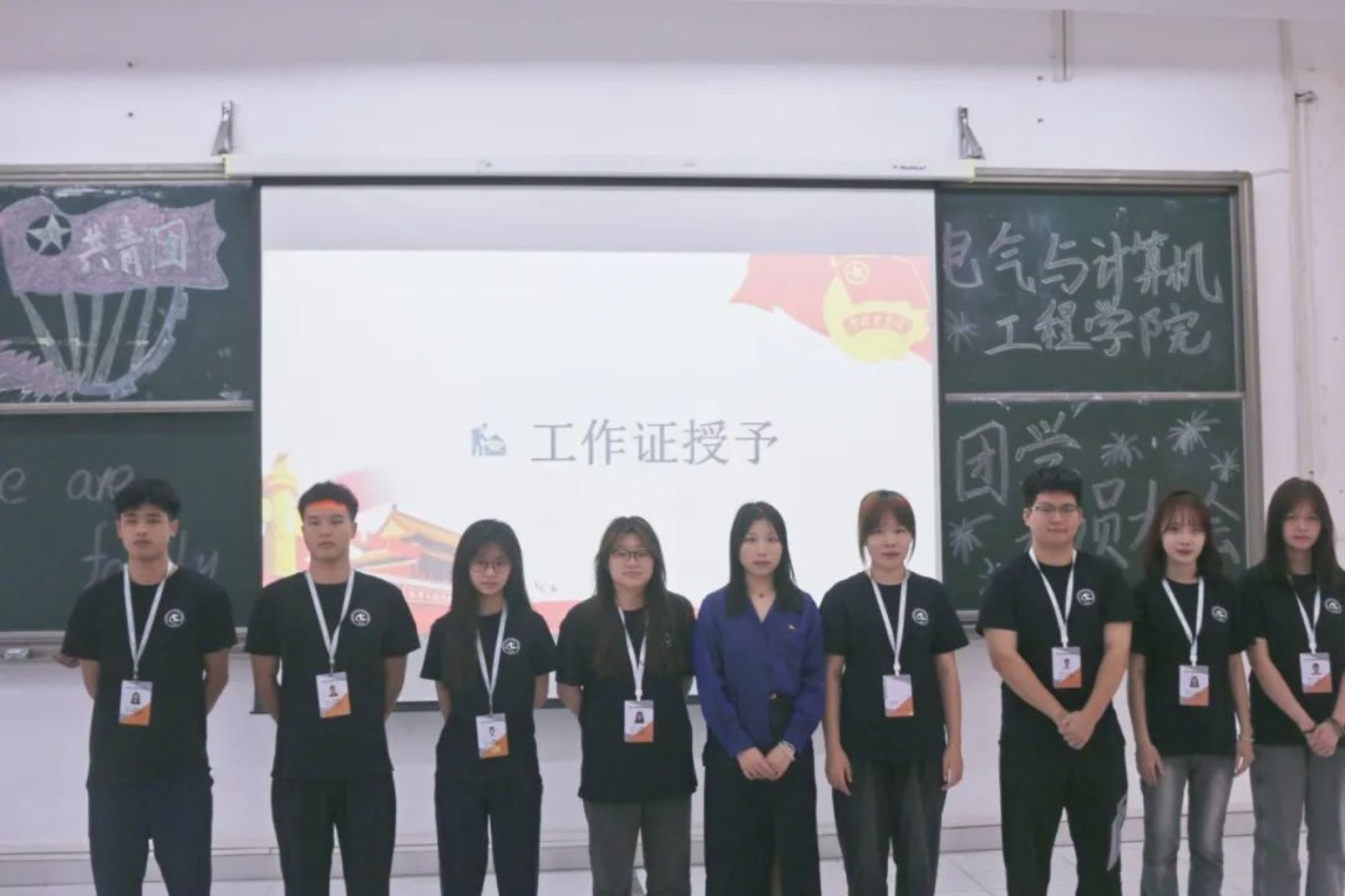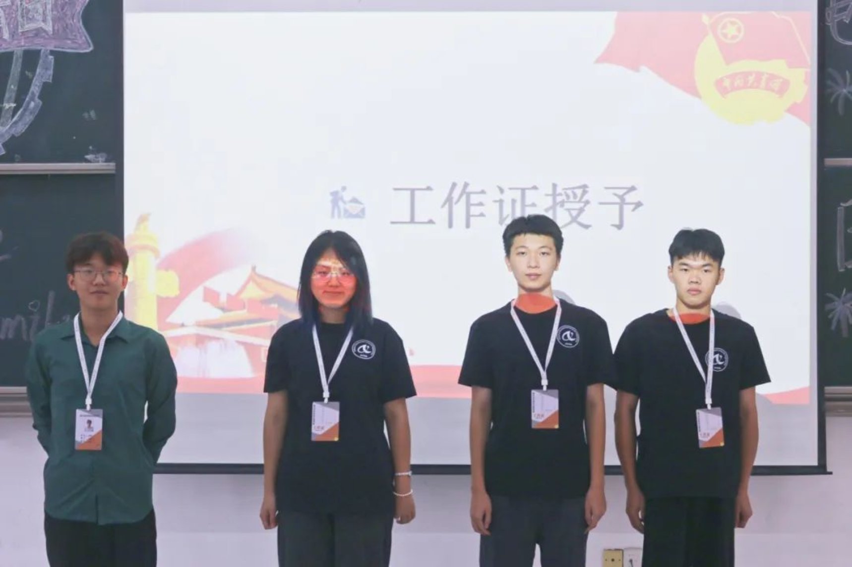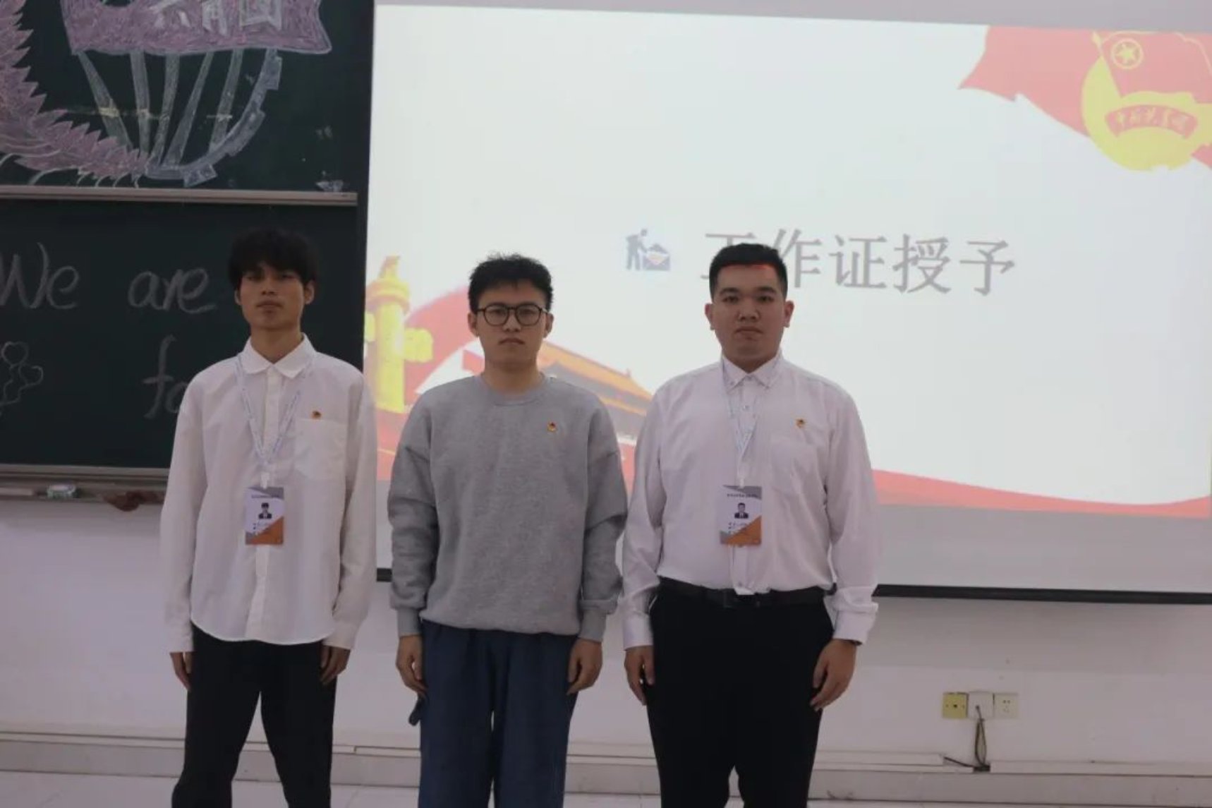 团委指导老师毛依丽、学生会指导老师李严为各组织学生干部授予工作牌