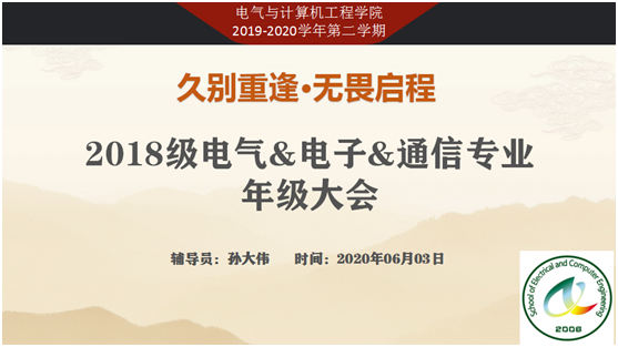 2020年6月4日是2018级电气学子重返校园的日子,为了能让同学们更好地适应特殊时期的校园生活,2020年6月3日星期三下午16:30,孙大伟老师组织我院2018级电气&电子&通信专业全体同学相约腾讯课堂,开展了一次“云端”年级大会,会议从以下五分方面进行。