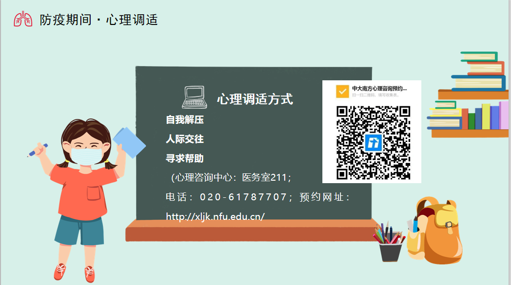 接着,陈老师与大家分享在学校特殊管理期间自己的解压方式,建议同学们劳逸结合,通过运动出汗、观看综艺节目、适当游戏娱乐等途径释放情绪和压力,也可以通过与好友、亲人、辅导员进行线上通话、面对面聊天等形式倾诉内心的想法,必要时可以寻求心理咨询中心的帮助。