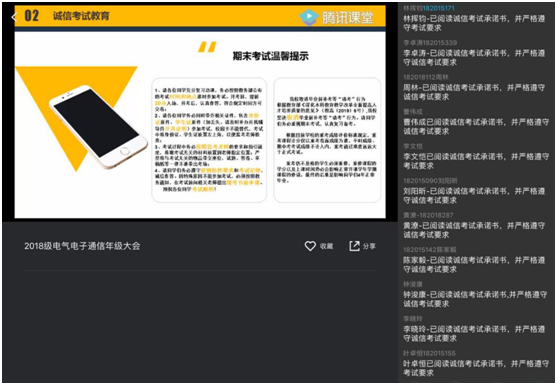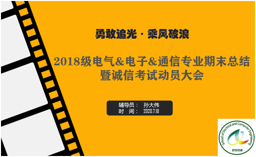特殊的学期迎来尾声,为了更好地总结本学期的学习生活,端正学风,严肃考纪,加强诚信考试动员和安全教育,培养同学树立科学的就业观。2020年7月18日下午12:50,孙大伟老师借助腾讯课堂与同学们一起开展主题为“勇敢追光·乘风破浪”的期末总结暨诚信考试动员大会,2018级电气、电子、通信专业全体同学参加。