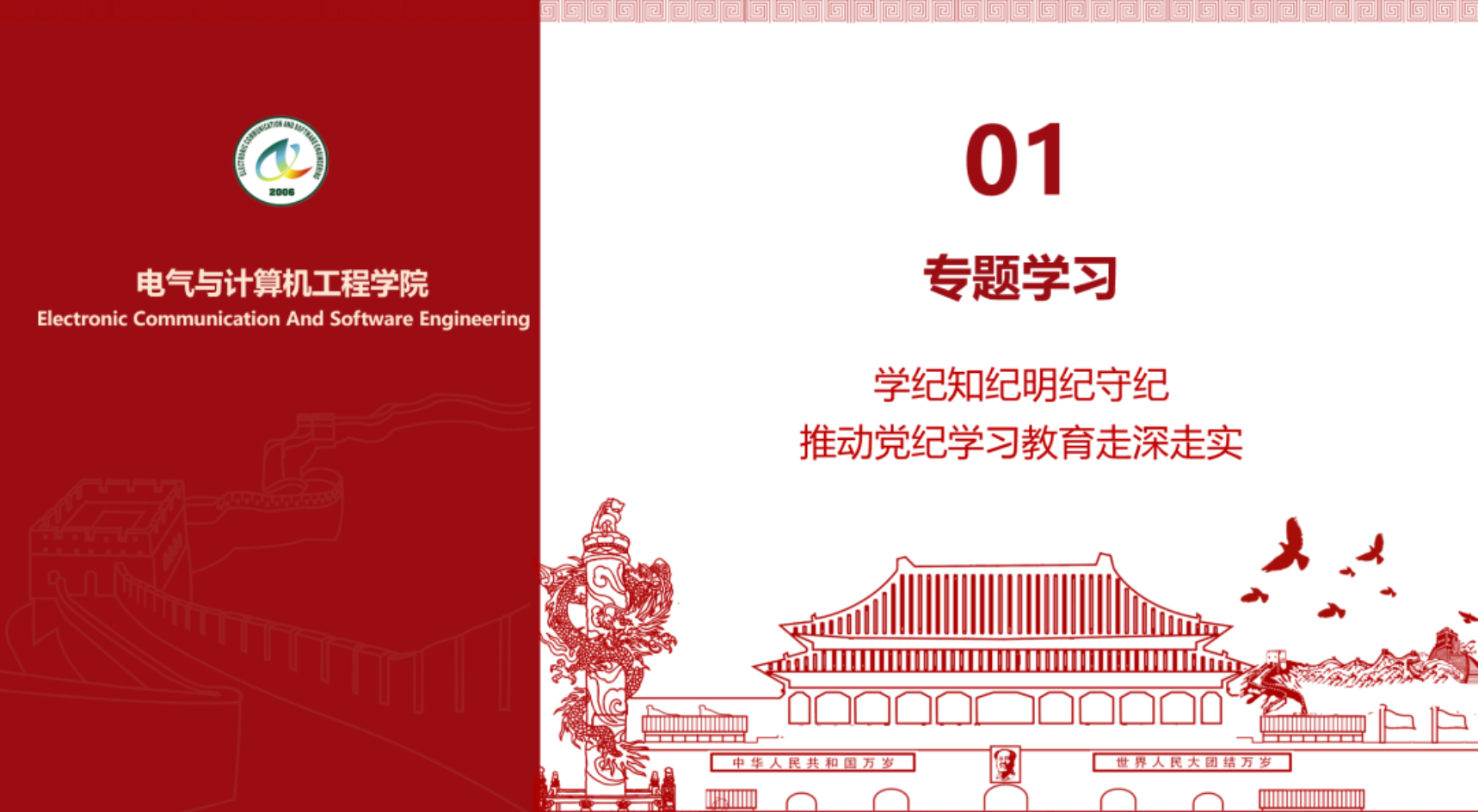 会议开始,学生会主席团成员刘向荣同学围绕“学纪知纪明纪守纪,推动党纪学习教育走深走实”的主题开展议题学习。学生会成员们通过学习,明白了严明纪律特别是政治纪律对于维护党中央权威和集中统一领导、提升党的凝聚力和战斗力的关键作用。作为新时代的青年学生,我们必须深刻领悟“两个确立”的决定性意义,坚决做到“两个维护”,将党纪学习教育融入日常,以实际行动践行党的纪律要求。在今后的学习、工作和生活当中,我们将不断提升自我修养和业务能力,主动挺膺担当,为推动强国建设、民族复兴的伟大事业不断向前发展而努力奋斗。