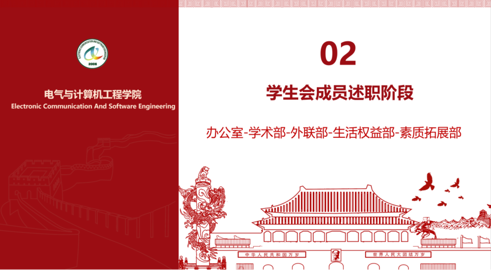 学生会主席团成员范文博同学在总结发言中,回顾了学生会一年来的工作成果与成长,强调了团队凝聚力和执行力的提升。他列举了学生会成功举办的多项活动,如IT文化节和电气杯等,这些活动不仅丰富了校园生活,还提升了同学们的综合素质。他对能与学生会各成员共事的这一年感到荣幸,并展望了学生会未来的发展,承诺将坚持全心全意为同学服务的宗旨,继续探索创新,学生会将会建设成更高效、更有影响力的学生组织。他对下一年度的学生会充满信心,期待学生会创造更多辉煌。