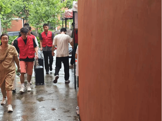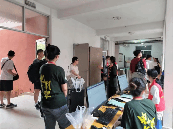 在校园内,一群身着鲜艳志愿服的志愿者在熙熙攘攘的人群中忙碌穿梭,形成了一道亮丽的风景线。他们热情洋溢,细心周到地引导新生们办理入学手续,规范有序地帮助他们运送行李,确保每位新生都能顺利、无忧地完成报到流程。