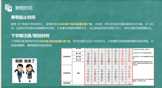 会议最后,何昕璇老师对元旦及寒假安排、离校安全、假期自我提升等事项进行了全面的部署。明确元旦放假时间为1月1日至3日,寒假从1月26日开始至2月27日结束,下学期注册时间为2月28日至3月1日。重点强调了离校前宿舍消防安全、个人财物保管、旅途交通安全以及居家期间的防诈骗意识,并希望大家合理规划假期生活,在放松休息的同时,通过阅读、学习新技能、参与社会实践等方式持续提升自我,以饱满的精神状态迎接新学期的挑战。
